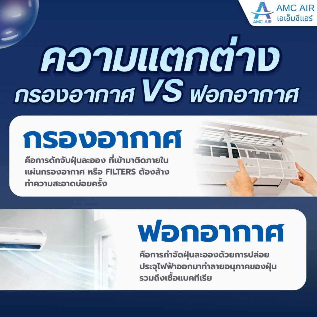 กรองอากาศและฟอกอากาศต่างกันที่เทคโนโลยีและเป้าหมาย กรองอากาศ (เช่น แผ่นกรองแอร์) ทำหน้าที่ดักจับฝุ่นละอองเชิงกลไม่ให้ผ่านไป ส่วน ฟอกอากาศ (Air Purifier) ใช้เทคโนโลยีขั้นสูง เช่น HEPA, ถ่านกัมมันต์, หรือประจุไฟฟ้าเพื่อกรองอนุภาคละเอียด ฆ่าเชื้อโรค และขจัดกลิ่นได้เบ็ดเสร็จกว่