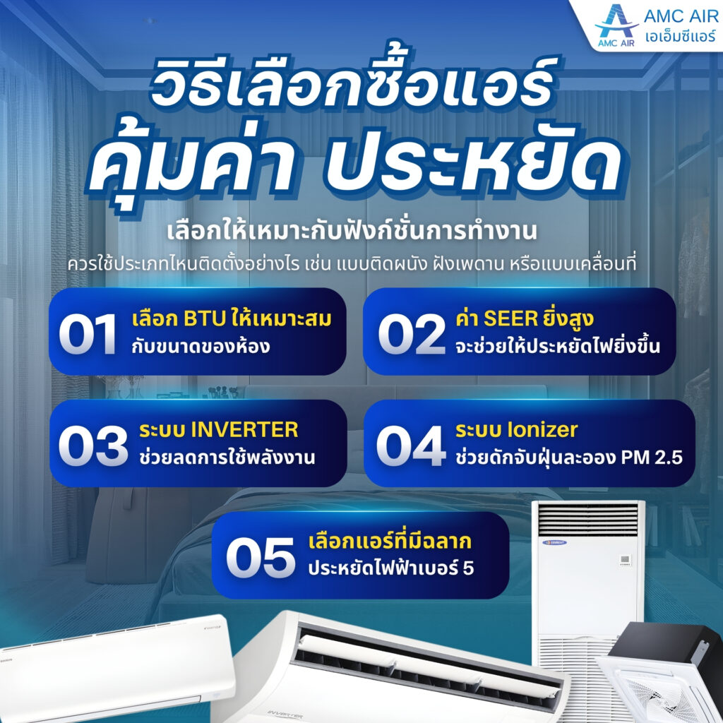 การเลือกซื้อแอร์ประหยัดไฟให้คุ้มค่าที่สุด ควรเลือกระบบ Inverter ที่มีฉลากประหยัดไฟเบอร์ 5 แบบ (3 ดาว) หรือสูงสุด, เลือก BTU ให้เหมาะสมกับขนาดห้อง (เช่น ห้องนอนทั่วไป 9,000-12,000 BTU), และดูค่า SEER สูง (ยิ่งสูงยิ่งประหยัด) เพื่อช่วยลดค่าไฟได้มากกว่า 30%