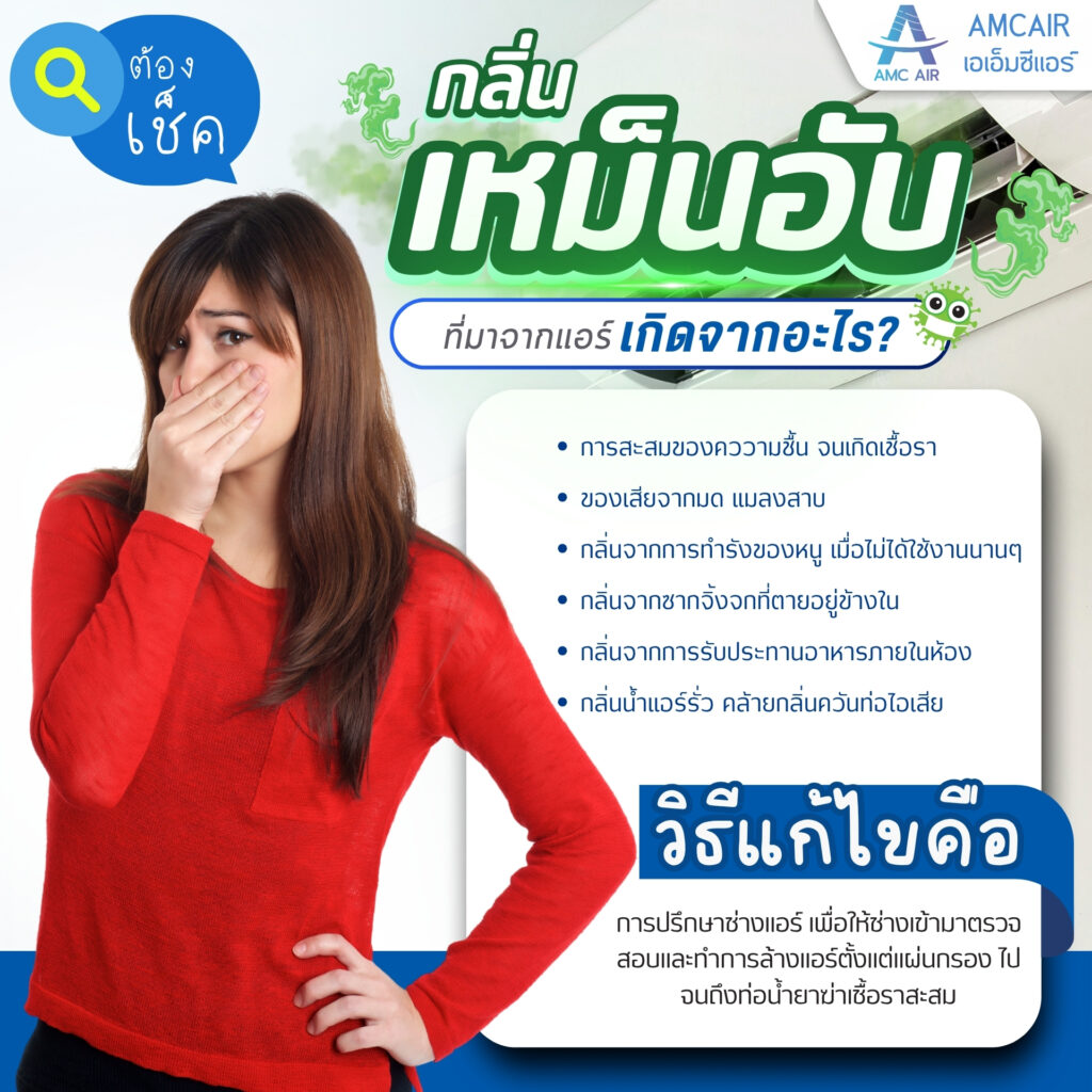 📍 วิธีแก้ไขคือ การปรึกษาช่างแอร์ เพื่อให้มาตรวจสอบ และทำการล้างแอร์ ตั้งแต่แผ่นกรอง ไปจนถึงท่อน้ำยาฆ่าเชื้อราสะสม