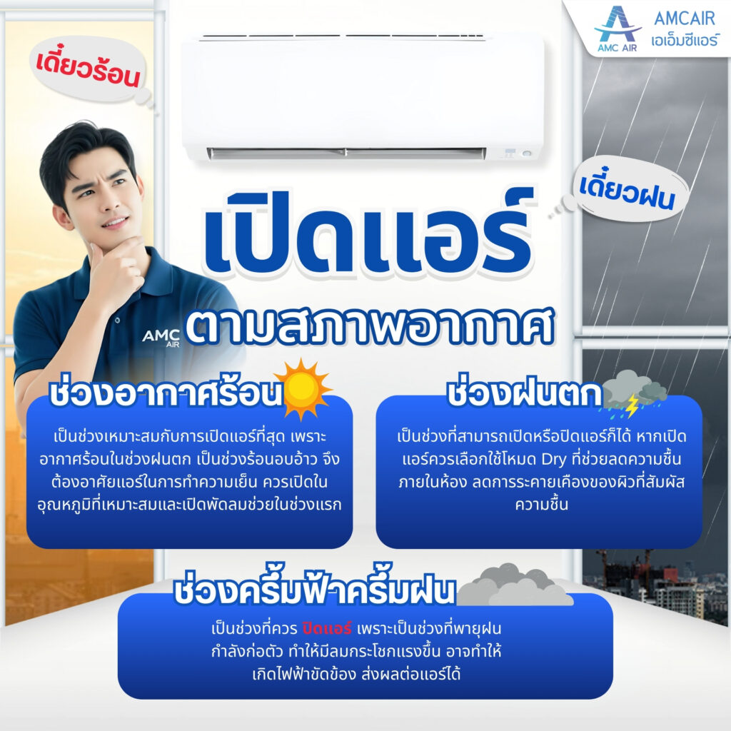 เป็นช่วงเหมาะสมกับการเปิดแอร์ที่สุด เพราะอากาศร้อนในช่วงหน้าฝน เป็นช่วงร้อนอบอ้าว จึงต้องอาศัยแอร์ในการทำความเย็น ควรเปิดในอุณหภูมิที่เหมาะสม และเปิดพัดลมช่วยในช่วงแรก