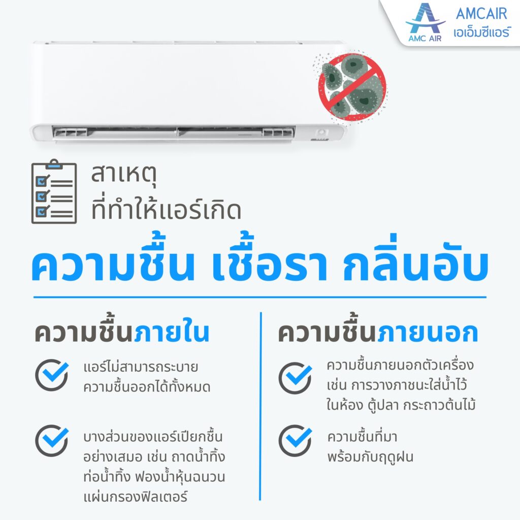 สาเหตุหลักที่ทำให้เครื่องปรับอากาศเกิดความชื้น เชื้อรา และกลิ่นอับ คือความชื้นที่สะสมอยู่ภายในเครื่องและระบบท่อ ซึ่งเชื้อราและแบคทีเรียจะเจริญเติบโตได้ดีในสภาพแวดล้อมที่ชื้นและอับ