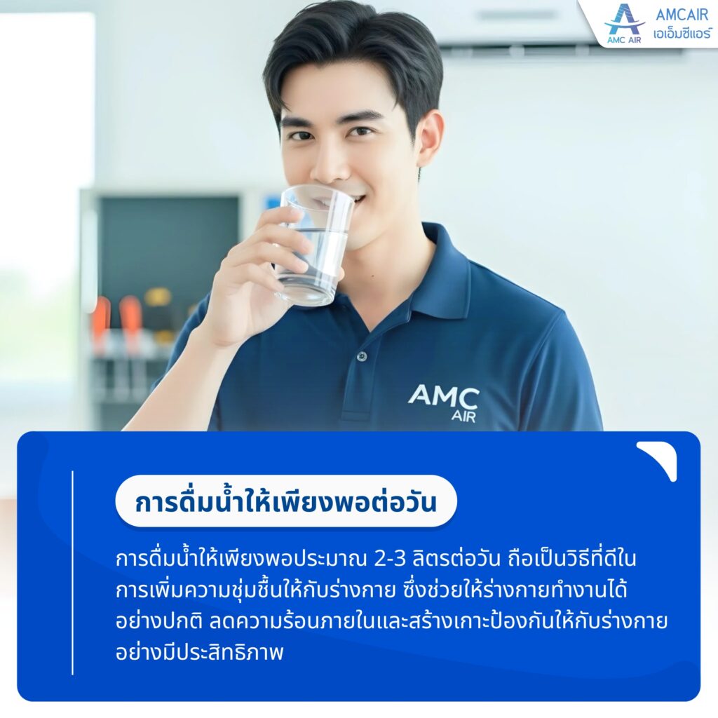 การดื่มน้ำให้เพียงพอประมาณ 2-3 ลิตรต่อวัน ถือเป็นวิธีที่ดีในการเพิ่มความชุ่มชื้นให้กับร่างกาย ซึ่งช่วยให้ร่างกายทำงานได้อย่างปกติ ลดความร้อนภายในและสร้างเกาะป้องกันให้กับร่างกายอย่างมีประสิทธิภาพ