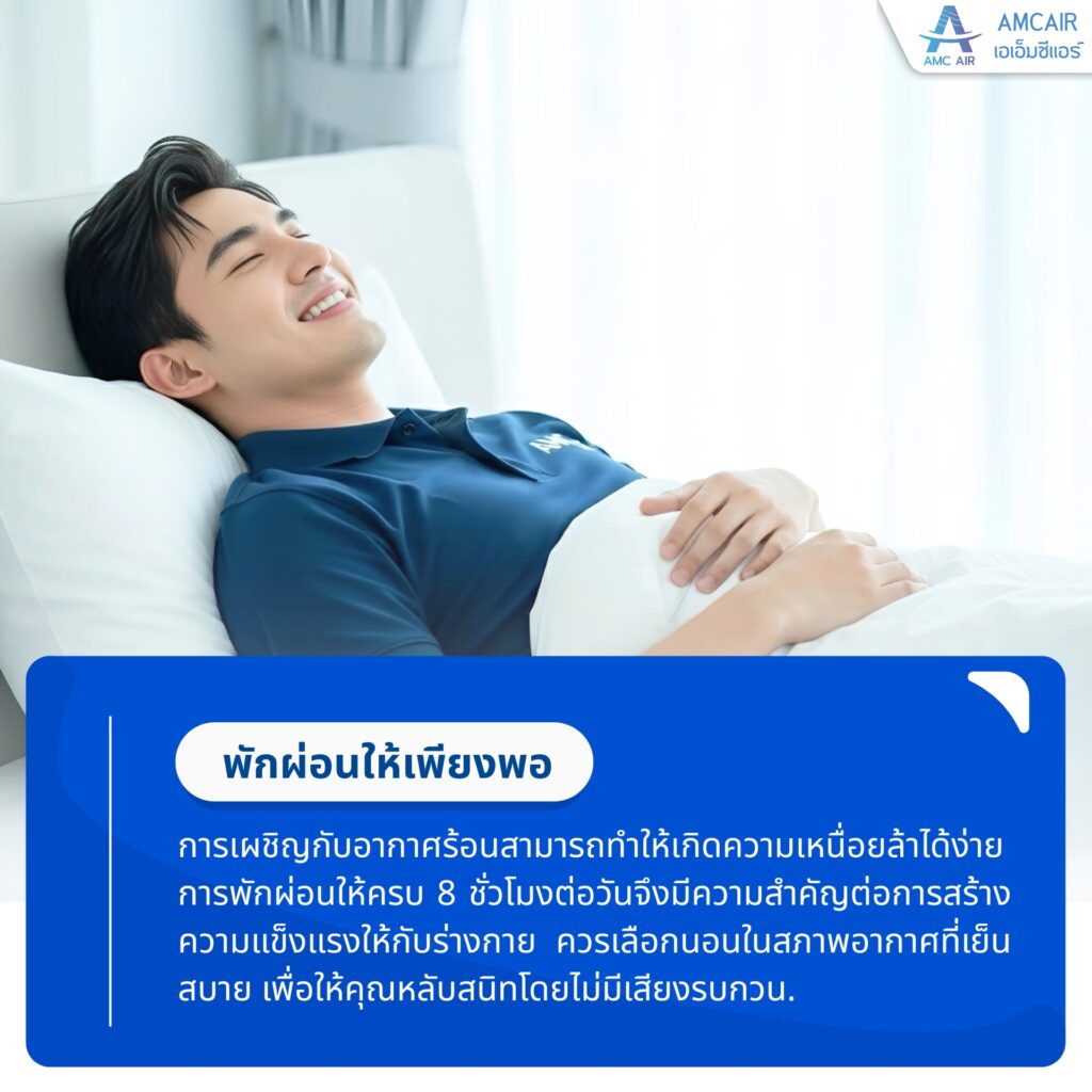 การเผชิญกับอากาศร้อนสามารถทำให้เกิดความเหนื่อยล้าได้ง่าย การพักผ่อนให้ครบ 8 ชั่วโมงต่อวันจึงมีความสำคัญต่อการสร้างความแข็งแรงให้กับร่างกาย ควรเลือกนอนในสภาพอากาศที่เย็นสบาย เพื่อให้คุณหลับสนิทโดยไม่มีเสียงรบกวน