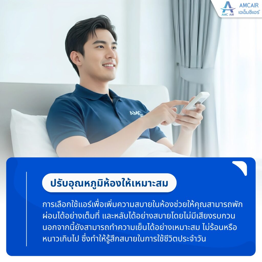 การเลือกใช้แอร์เพื่อเพิ่มความสบายในห้องช่วยให้คุณสามารถพักผ่อนได้อย่างเต็มที่ และหลับได้อย่างสบายโดยไม่มีเสียงรบกวน นอกจากนี้ยังสามารถทำความเย็นได้อย่างเหมาะสม ไม่ร้อนหรือหนาวเกินไป ซึ่งทำให้รู้สึกสบายในการใช้ชีวิตประจำวัน