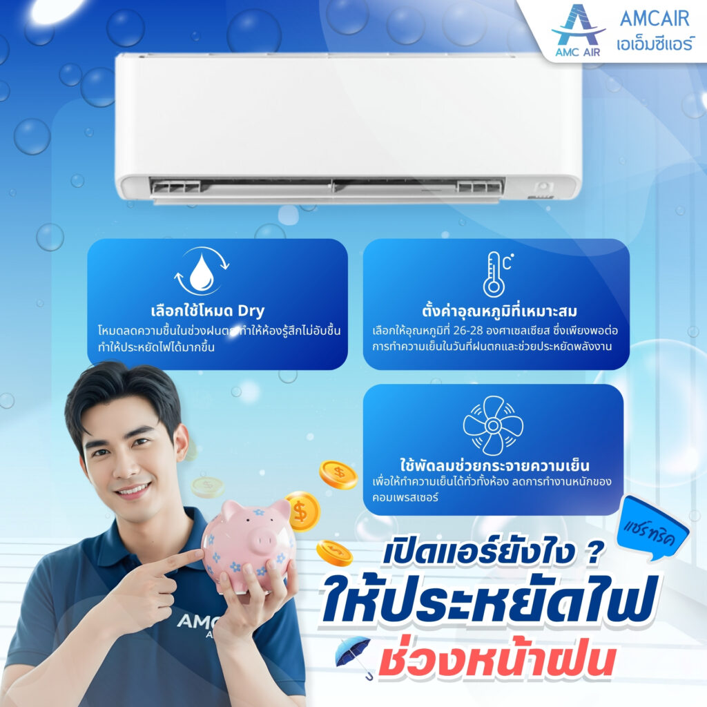 การเปิดแอร์ให้ประหยัดไฟช่วงหน้าฝนทำได้โดยใช้ โหมด Dry เพื่อลดความชื้นและประหยัดพลังงาน, ตั้งอุณหภูมิที่ 26-28 องศาเซลเซียส, ใช้พัดลมช่วยกระจายลม, ตั้งเวลาปิดแอร์ให้เหมาะสม เช่น ก่อนตื่นนอน หรือในช่วงเช้าที่อากาศเย็น และ หมั่นล้างแอร์เป็นประจำ.