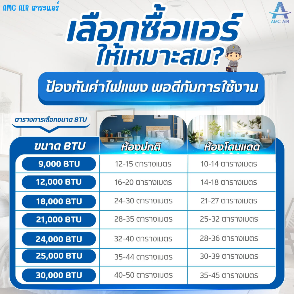 ตารางการเลือกขนาด BTU ให้เหมาะสมกับห้อง